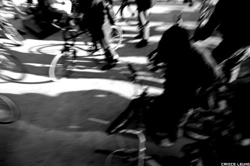 What possessed me to do such a hippie thing? On an ordinary day, cycling from my house at College/Bathurst to school at Yonge/Dundas could include 3 or 4 near-dooring incidents, being cut off (or almost crushed) by trucks, and drivers who ignore bike lanes and side-swipe me. Thankfully, I’ve never been in a crash yet, but it’s bound to happen soon; in the wake of two fatal bike-car accidents this month, participation seems more relevant than ever. So I hooked up with my two bikester/foodster/gumster friends Jason and Matt to, you know, just go around, and take back the streets of downtown Toronto in blissful ecologically-friendly traffic jamming with 120+ other cyclists.